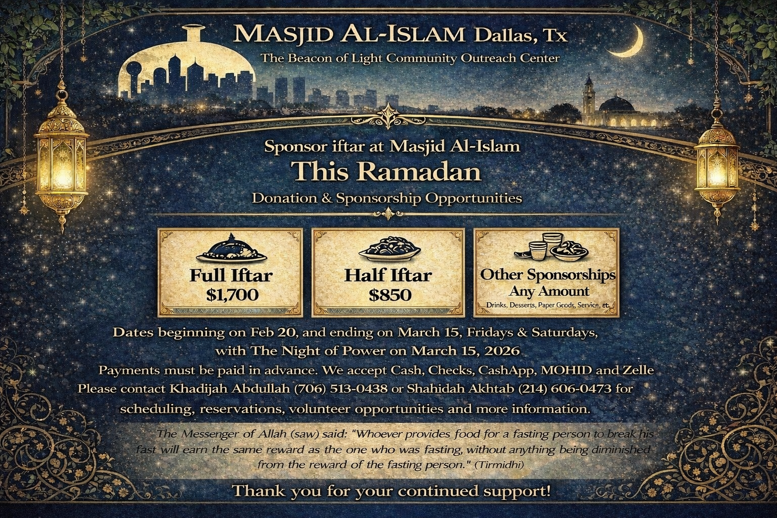 Sunday, February 15th, 5:00 PM - Ramadan Orientation with Imam Muhammad Abdul-Jami. The first night of Ramadan is expected on February 17th. The first day of fasting is expected on February 18th. Join the Zoom Meeting to remind or inform you about the rules and procedures for the Ramadan Fast. Meeting ID: 831 9937 6607 | Passcode: 450812